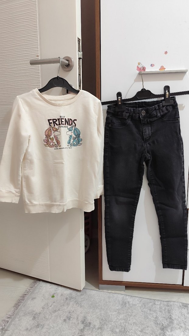 krem sweatshirt ve antrasit renk Jean ikiside lcwaiki üst 7-8 yaş alt 6-7 yaş ikisini aynı dönemde giydi. temiz çok kullanışlı likralı ve beli ayarlanabilir kot pantolon.