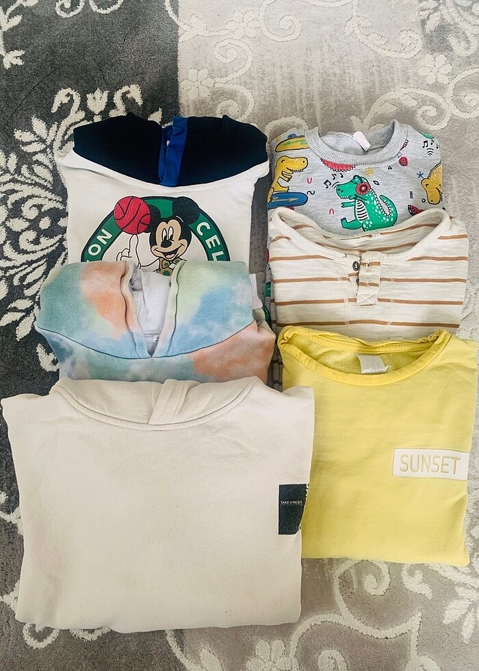 Bazı deformasyonlar ve yıpranmalar var görsellerde görüldüğü gibidir belli olmuyor krem sweet kapşon arkasında yırtı var ama kullanılmadı sürece görülmüyor karışık renkli 11 yaş diyor ama 4 Ike 6 yaş için daha uygun toplu fiyattır.