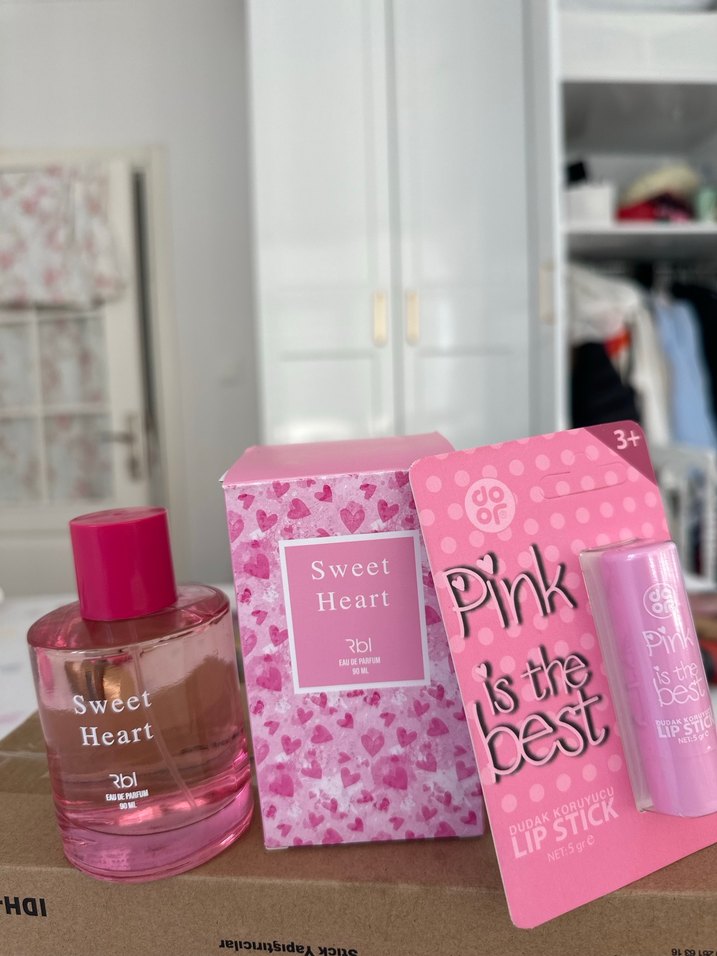 Sweet Heart kadın parfümü ve pembe dudak balmı seti. Parfüm tatlı, kalp temalı tasarıma sahip. Dudak balmı pembe ve nemlendiricidir.