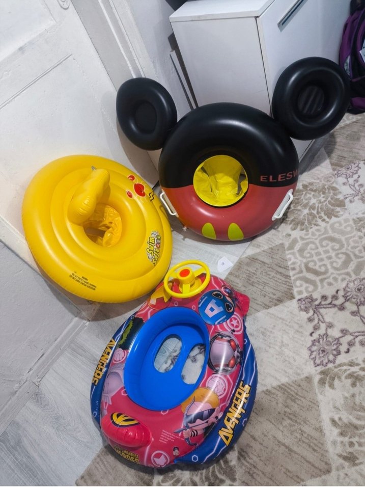 hepsi yeni gibi, mickey mouseli olanda küçük bir leke var sadece, son fotoğrafa ekledim. arabalı olanın kornasi sesli fiyatı 430 tl, mickey siyah kulakli olan 500, swim safe 500 tl