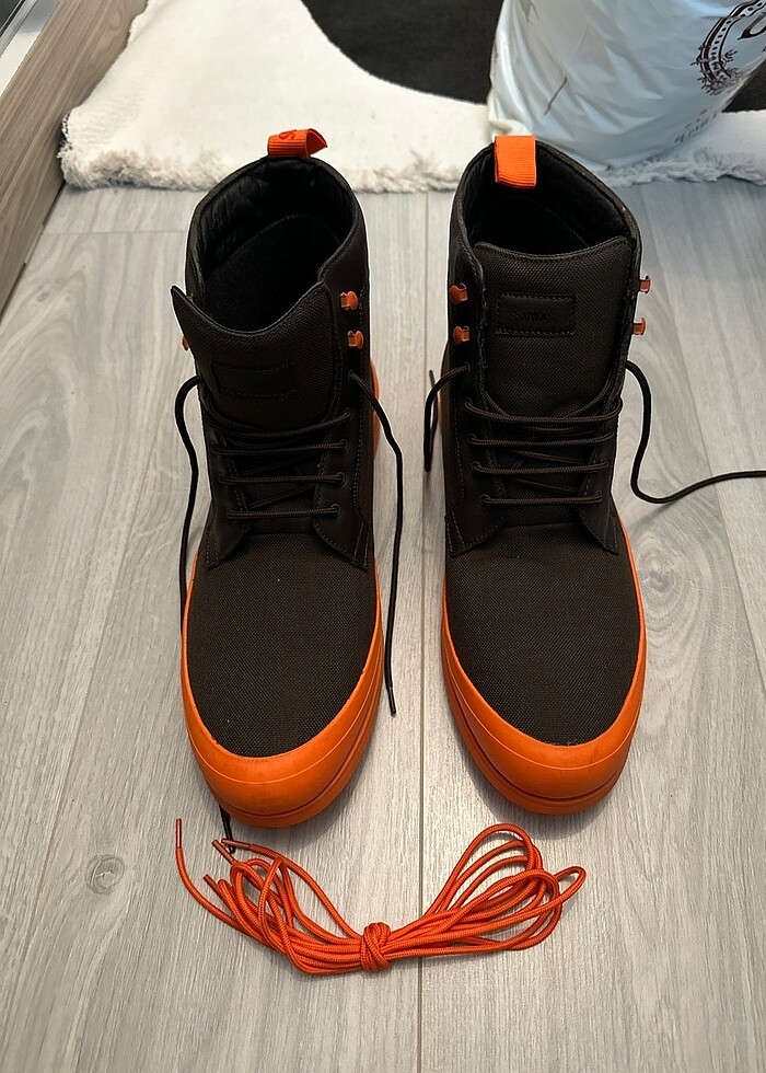 Kutusuz kahverengi ve turuncu ekstra bağcıklı Swims marka bot sneakers