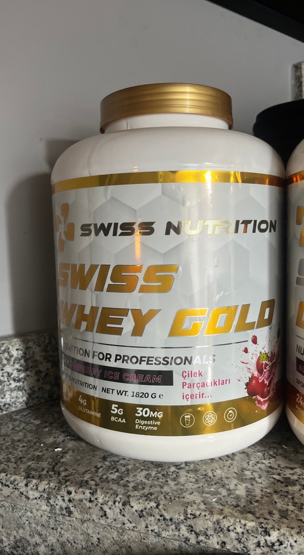 Swiss Whey Gold, çilek aromalı tozdur ve porsiyonda 5g BCAA, 4g glutamin ile 30mg sindirim enzimi içerir. Parlak altın detaylı ambalajda sunulur.