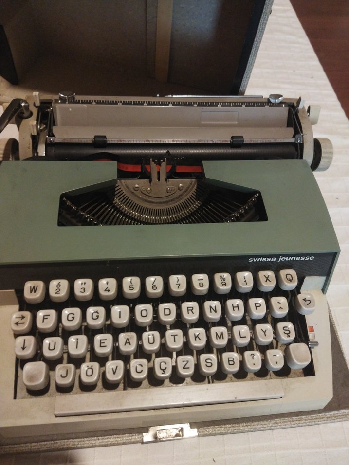 Beyaz tuşlu ve gri gövdeli Swissa Jeunesse mekanik daktilo. Klasik düzen ve kompakt tasarım sunar. ️
