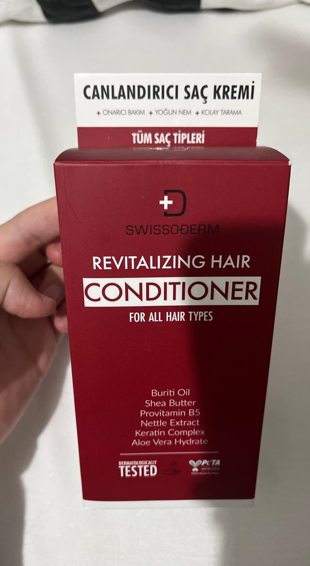 Swissoderm canlandırıcı saç kremi, tüm saç tipleri için buriti yağı, shea yağı, provitamin B5, ısırgan ekstresi, keratin kompleksi ve aloe vera ile yoğun nem, onarıcı bakım ve kolay tarama sağlar.