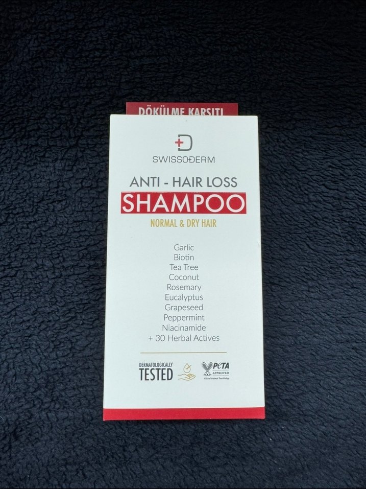 Swissoderm saç dökülmesine karşı şampuan, normal ve kuru saçlar için sarımsak, biotin, çay ağacı, hindistancevizi, biberiye, okaliptüs, üzüm çekirdeği, nane, niasinamid ve 30'dan fazla bitkisel aktif içerir. Dermatolojik olarak test edilmiştir.