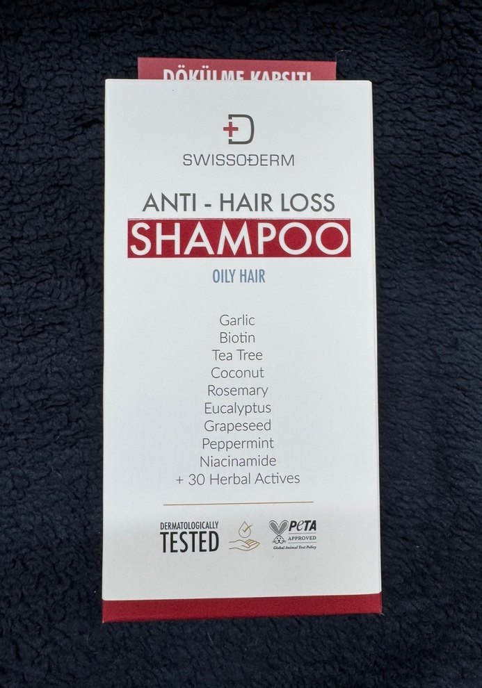 Swissoderm yağlı saçlar için saç dökülmesine karşı şampuan, sarımsak, biotin, çay ağacı, hindistancevizi, biberiye, okaliptüs, üzüm çekirdeği, nane, niasinamid ve 30'dan fazla bitkisel aktif içerir. Dermatolojik olarak test edilmiştir.