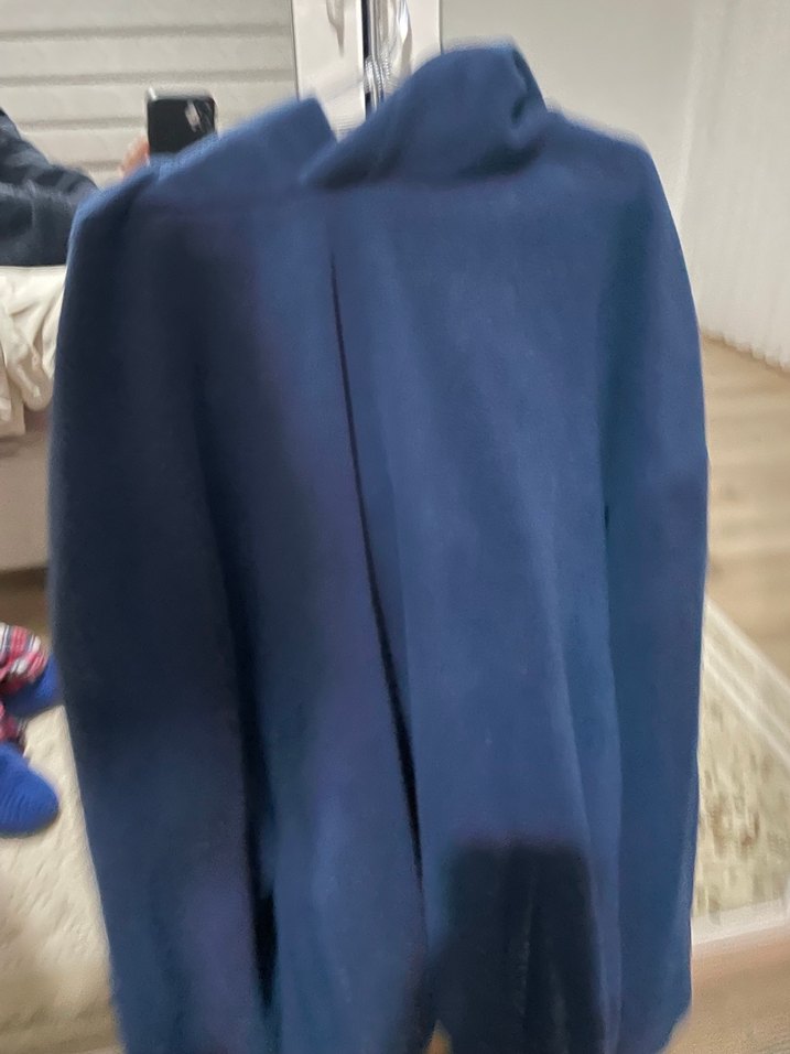 Fitted kesim, mavi renkte, notched lapel yakalı ve uzun kollu midi boy hamile kabanı. Yumuşak ve sıcak kumaştan, drapeli tasarıma sahip