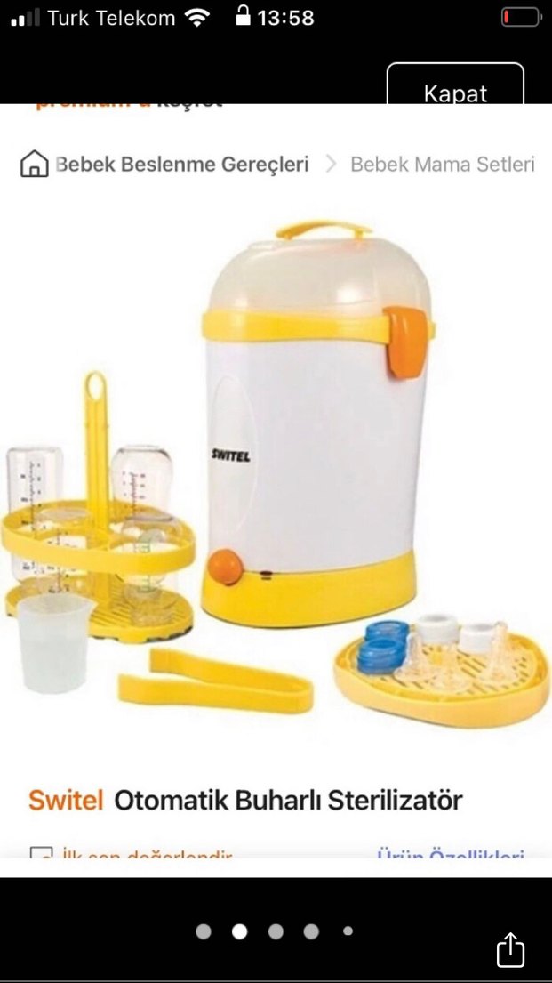 Switel otomatik buharlı sterilizatör, renkli tasarımı ve etkili sterilizasyonu ile bebek beslenme gereçleri için uygundur. Birden fazla raf ve tutma kolu bulunur.