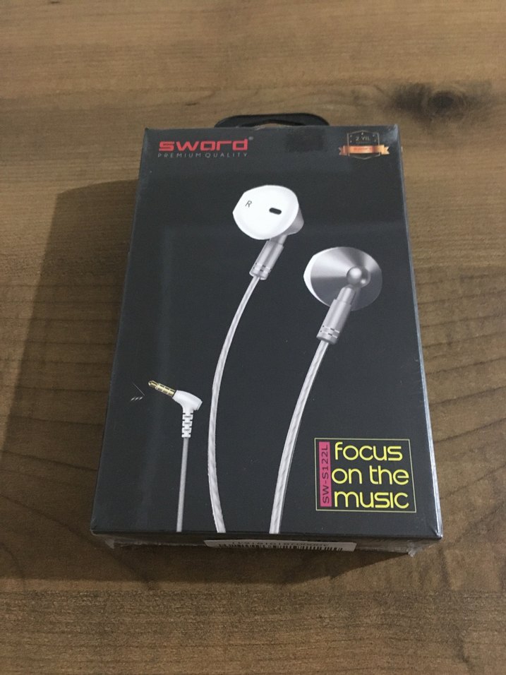 Sword beyaz kulak içi kulaklık, gri kabloya sahip. Müzik odaklanmanızı sağlar . 3.5mm açılı jak bağlantısı bulunur.