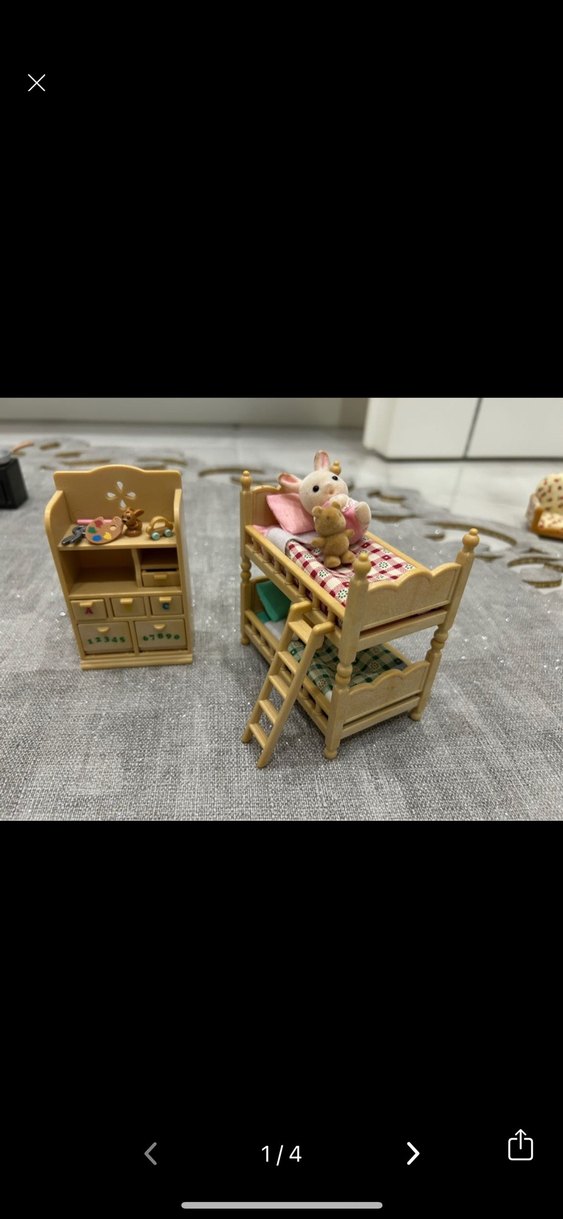 Pastel altın renkli minyatür oyuncak bebek mobilyası seti; merdivenli ranza ve küçük dolap, detaylı aksesuarlar ve ranza üzerinde küçük oyuncak figür içerir. ️