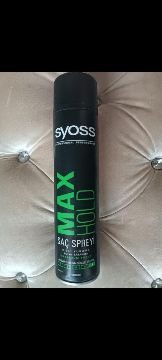 Syoss Max Hold saç spreyi, hızlı kuruma ve kolay tarama sağlar, 48 saate kadar güçlü tutuş sunar. 400 ml şişede.