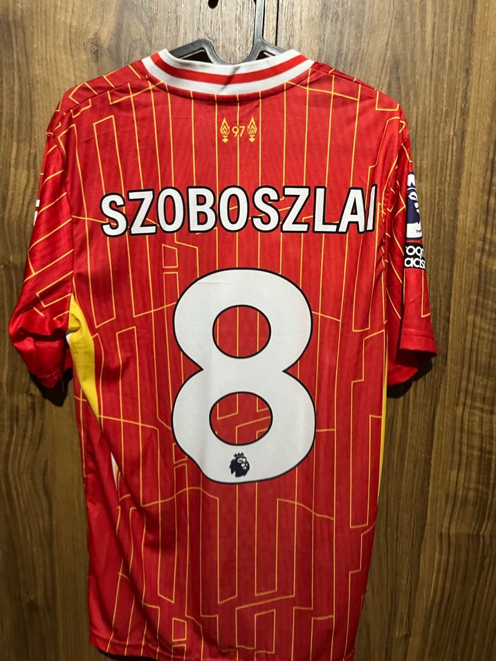 Kırmızı baskılı, kısa kollu erkek spor tişörtü. Salaş kesim, yuvarlak yaka ve düğmeli detaylı. Arkasında SZOBOSZLAI ismi ve 8 numara bulunur.