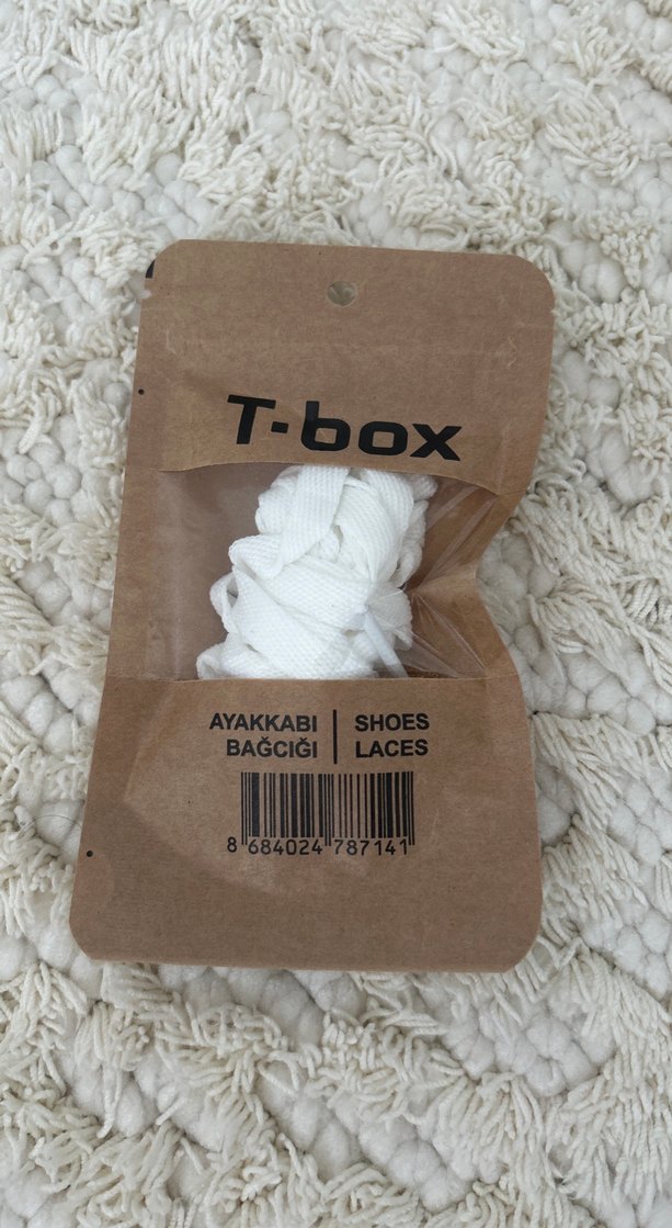 T-box beyaz ayakkabı bağcığı, yumuşak ve rahat dokuda, streetwear tarzına uygun. Hafif ve açık renkli, günlük kullanım için idealdir.