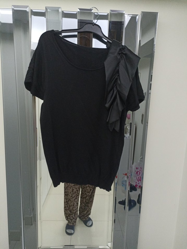 Siyah renkli, dökümlü detaylı, bisiklet yaka kısa kollu Midi boy ve rahat kesim, şık günler için ideal önündeki saten detayla çok zarif duruyor triko 42 44 uyumlu