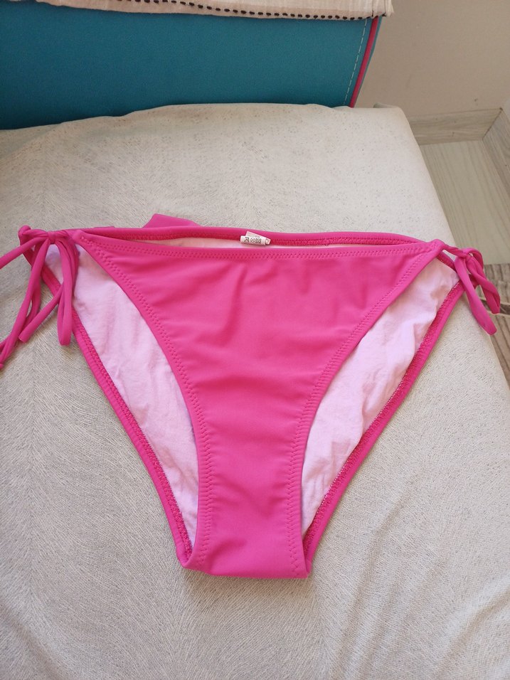 Pembe, ipli ve düz desenli kadın bikini altı, cesur plaj görünümü için uygundur.