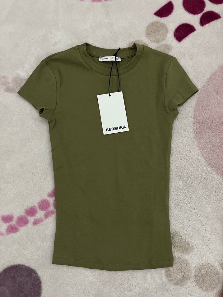 Bershka markasına ait, kısa kollu, bisiklet yaka, haki renk mini tişört. Sentetik kumaştan üretilmiş, rahat ve şık görünümlü.