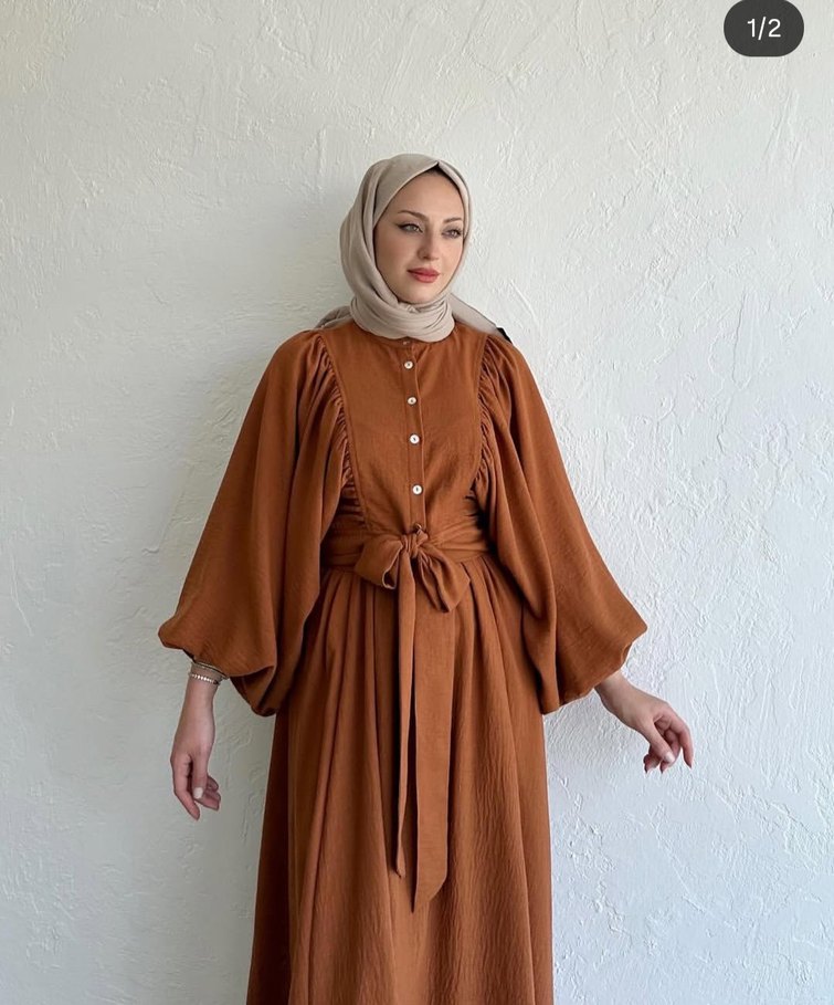 taba etekli takım, uzun dökümlü kollu ve bol kesimdir. Keten kumaştan yapılmış, belde bağlama detayı bulunur.