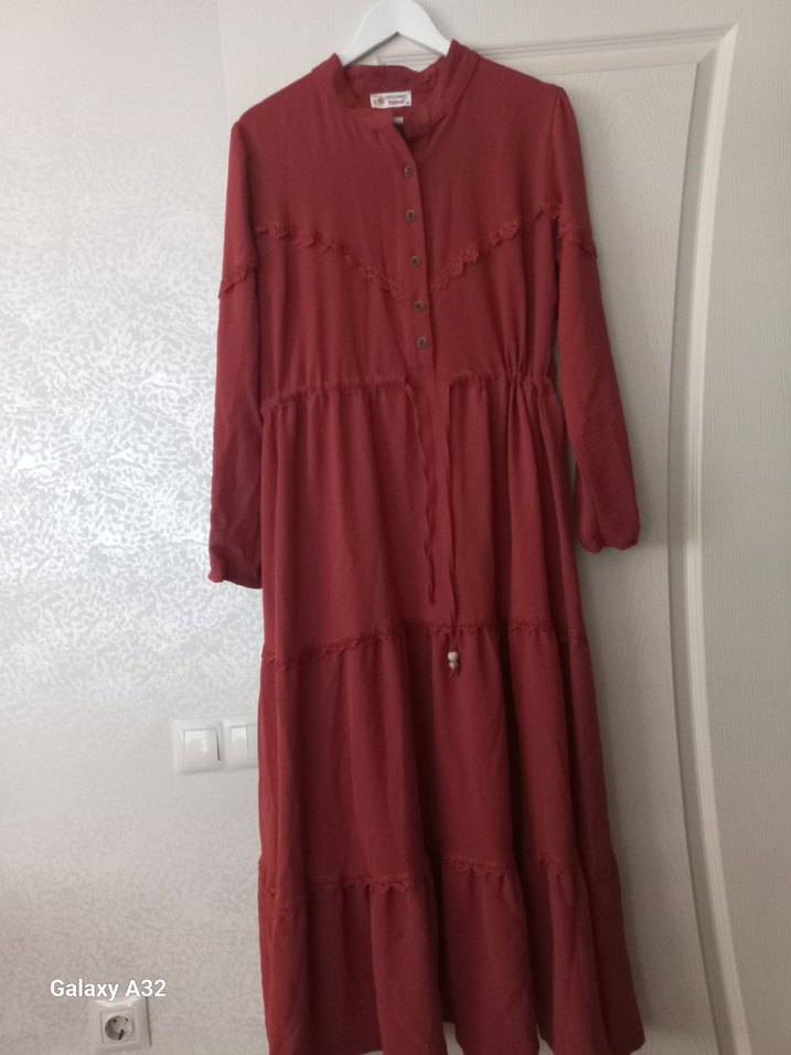 Taba renkli, nakışlı desenlere ve fırfır detaylara sahip bol kesim uzun elbisedir. Uzun kollu ve yuvarlak yakalı, yumuşak sentetik kumaştan yapılmıştır.