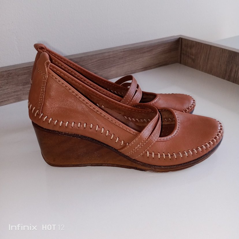Aşırı yumuşak Taba deri kadın babetler dolgu topuklu ve bantlı kayışa sahiptir. Minimalist tarzda, günlük kullanıma uygundur.