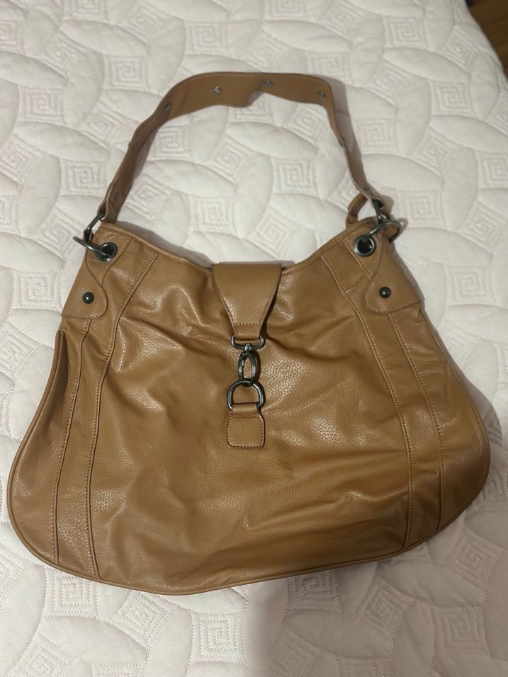 Hiç kullanılmadı kusuru yoktur. Parlak taba rengi deri, tokalı kadın çantası.