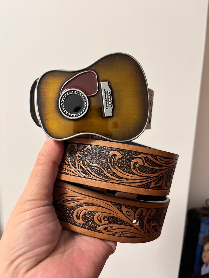Kahverengi deri, gitar şeklinde tokalı kadın kemeri, kabartmalı vintage desenlerle bohem ve retro tarzlar için uygun. Uzunluk 110cm. En 3.8cm