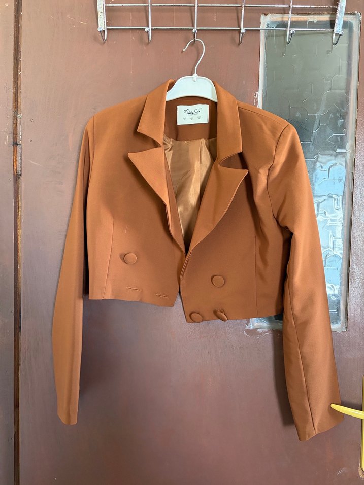 Düğmeli, taba mini blazer ceket. Uzun kollu ve regular fit, günlük sokak stili için uygun. Sentetik kumaştan üretilmiştir. Marka tems