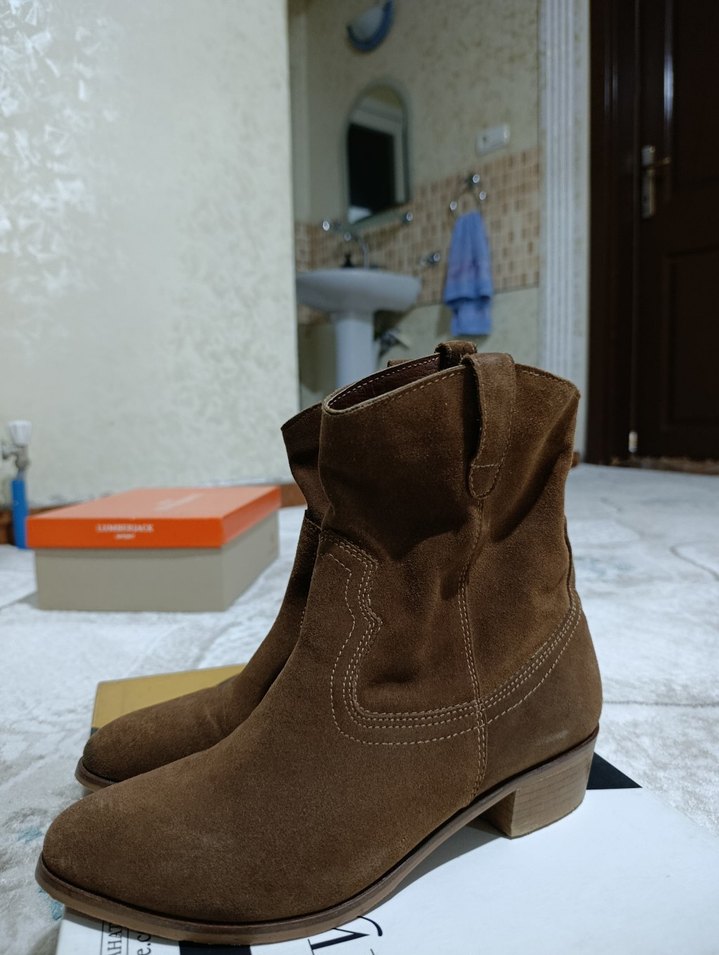 Kahverengi süet kadın botları, blok topuklu ve tokalı detaylı, bohem tarzda, günlük kullanıma uygun. bir kez giyildi