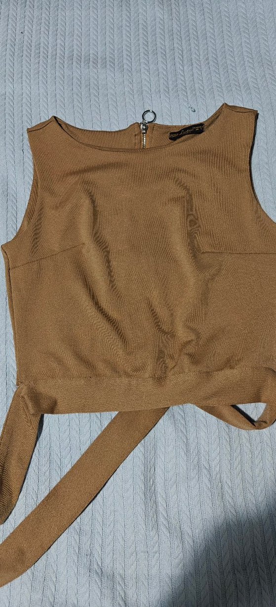 Taba rengi, kemer detaylı, kolsuz ve bisiklet yakalı, vücuda oturan kadın atlet. Günlük sokak stili için uygundur.