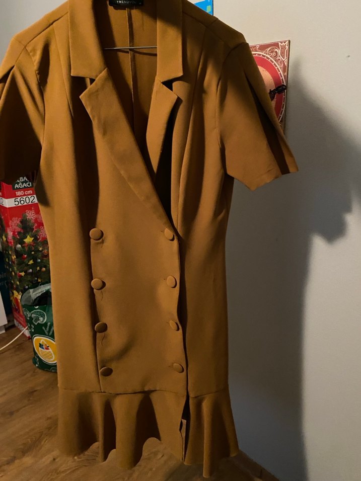 Kahverengi taba, midi boy, kısa kollu kadın elbise. Düğmeli ve kesik yaka detaylı, iş ve günlük kullanım için uygun. Boyu arka uzunluk 90cm bel 38cm