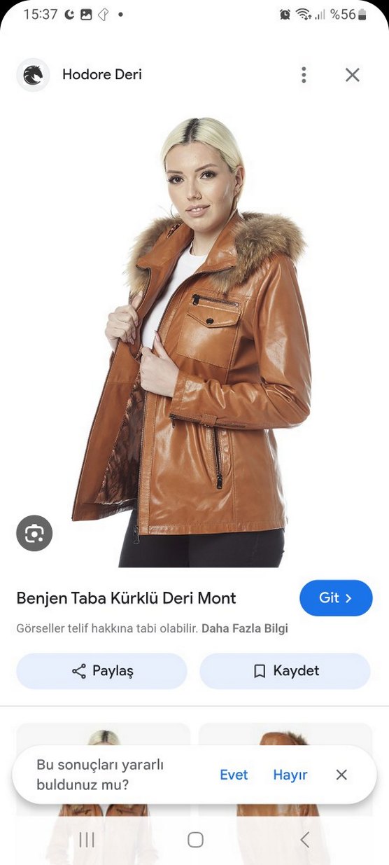 Bej renkli deri mont, kürklü yakası ve çıtçıtlı cepleriyle dikkat çeker. Parlak görünümü ve regular fit kesimiyle günlük sokak stiline uygundur. ✨