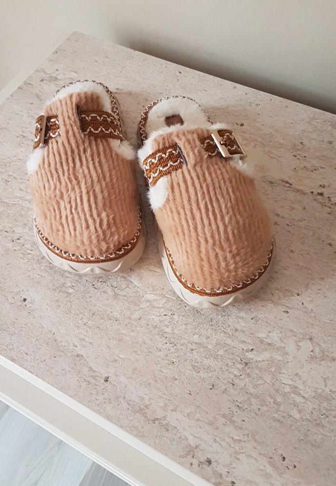 Taba renkte, nakışlı detaylara ve keçe dokusuna sahip, tokalı, bohem tarzda kadın terliği. Günlük kullanıma uygun, her numara mevcut