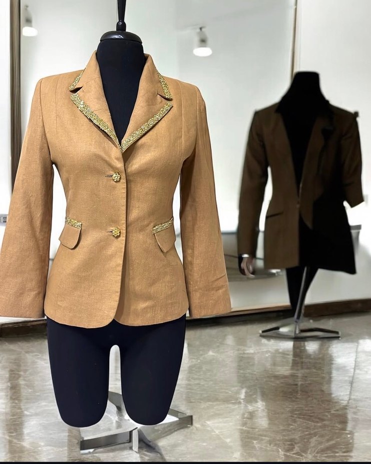 Taba renkli, düğmeli ve uzun kollu kadın blazer. Notlu yakada parlak taş şerit klasik ham keten kumaştan dikildi çağdaş ofis tarzı için uygundur. 34-36-