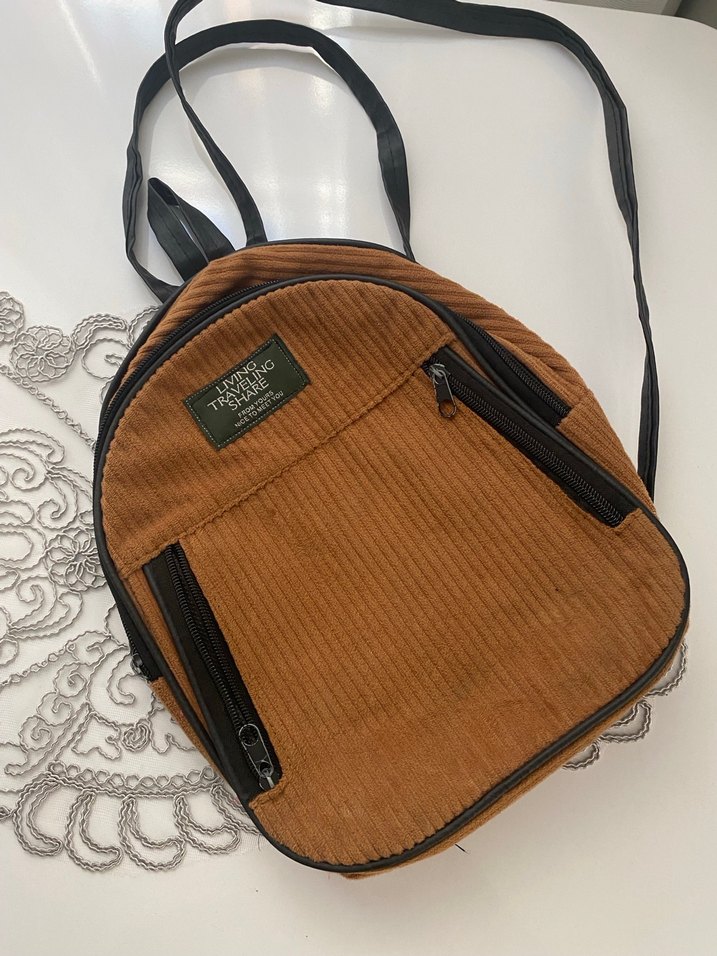 Taba rengi süet malzemeden yapılmış, fermuarlı ceplere sahip minimal desenli kadın sırt çantasıdır.