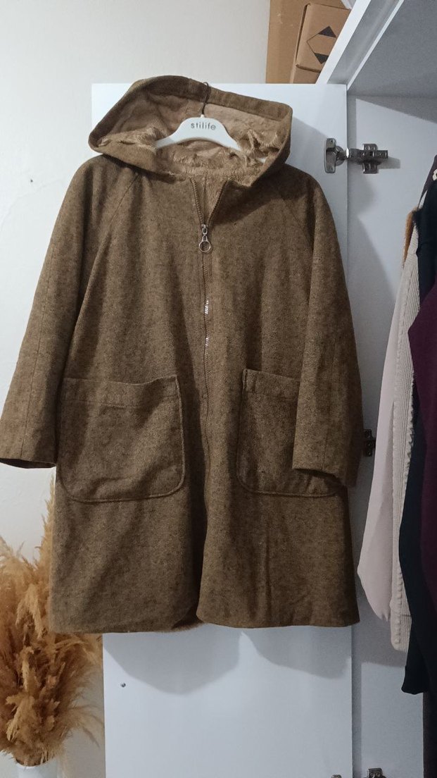 Kapüşonlu, fermuarlı ve cepli taba rengi yün kaban. Bol kesim ve midi boy ile rahat kullanım sağlar.