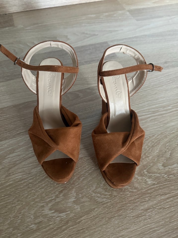 Taba rengi süet dolgu topuklu kadın ayakkabısı, tokalı kayışı ve minimalist, çağdaş tarzıyla klasik zarafeti yansıtır. ✨