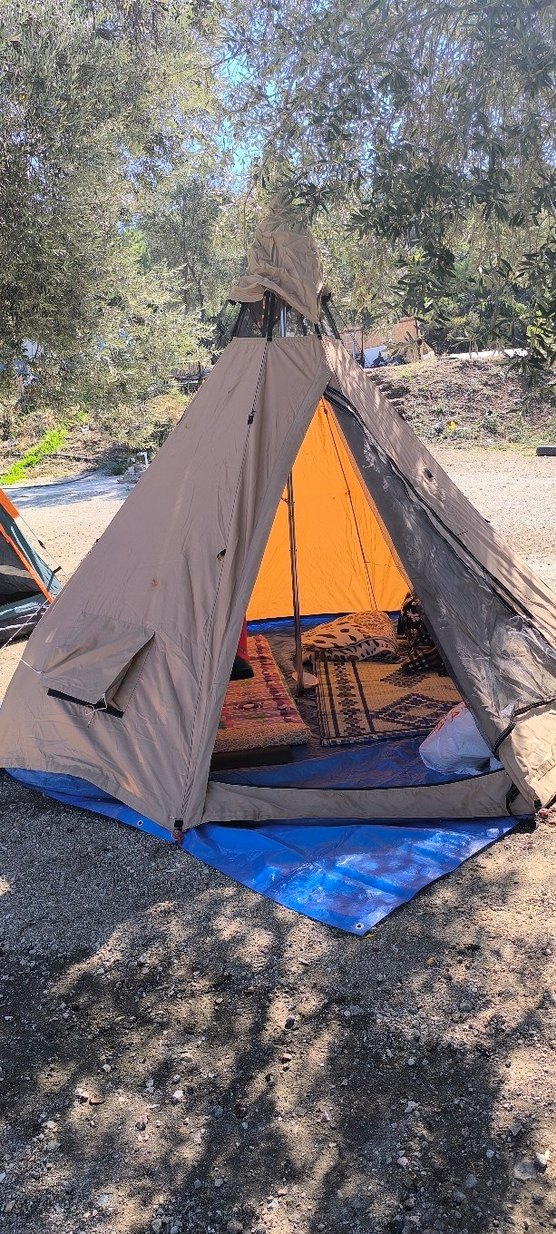 4 kişilik ten tipi çadır soba kurulabilir üç cam ve tepe havalandırma var tabanı orijinal brandalı ( pro dört mevsim ) yan metallerde ıslanmadan dolayı hafif paslanması var