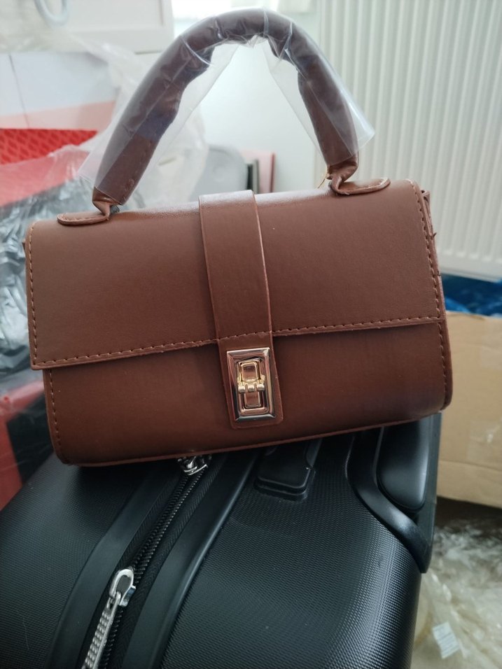 Kahverengi deri kadın çanta, parlak yüzeyli ve tokalı kapanışlıdır. Günlük kullanım için modern klasik tarzda tasarlanmıştır.