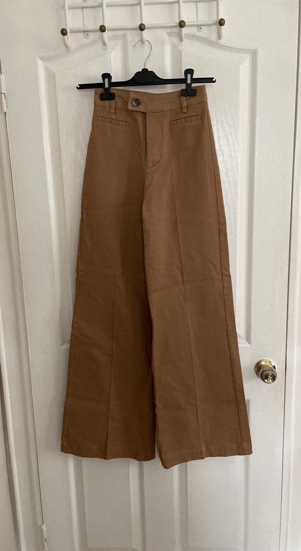 Taba renk yüksek bel asimetrik düğme detaylı bol paça jean. Boyum 165 biraz topuklu ile giyiyordum. Artık küçük geldiği için satıyorum. Baya kaliteli.