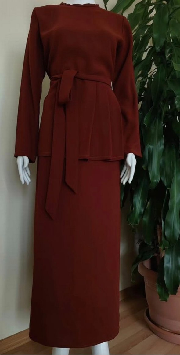 taba renkli, drapeli tasarıma sahip uzun elbise. Notlu yaka ve uzun kollu, sentetik dokulu kumaştan üretilmiştir. Ofis için klasik ve sade şıklık sunar.
