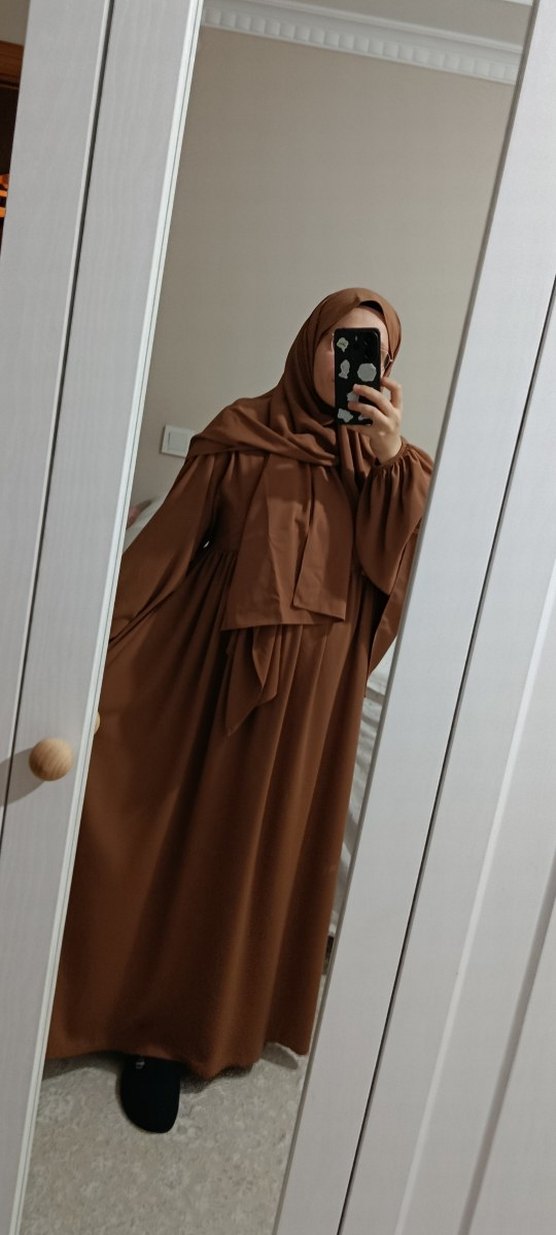 Sayılı kullanıldı yeni gibi. Kumaşı medine ipeği. Boyu çok uzundu yaklaşık bir iki cm kestirmiştim ona rağmen yine biraz uzun oluyor. Fotoğraftaki kişinin boyu 1.57. Şal ile elbise takım aynı renk. Şal dahil fiyatı.