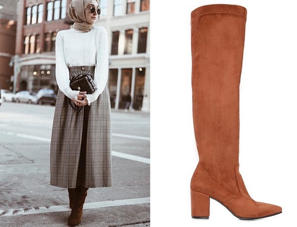 Yumuşak süet malzemeden yapılmış kahverengi diz boyu botlar, blok topuk ve kemer detayıyla minimalist bir görünüm sunar.