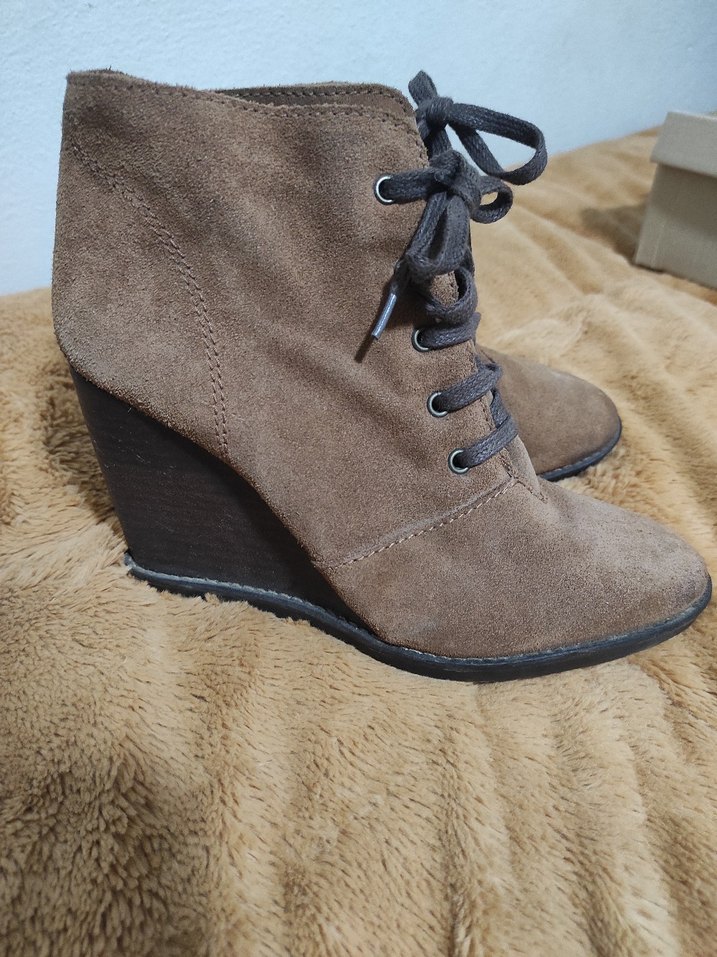 Taba süet malzemeden yapılmış, bağcıklı ve kürklü detaylara sahip dolgu topuk botlardır. Günlük kullanım için uygun, bohem tarzda rahat bir modeldir.