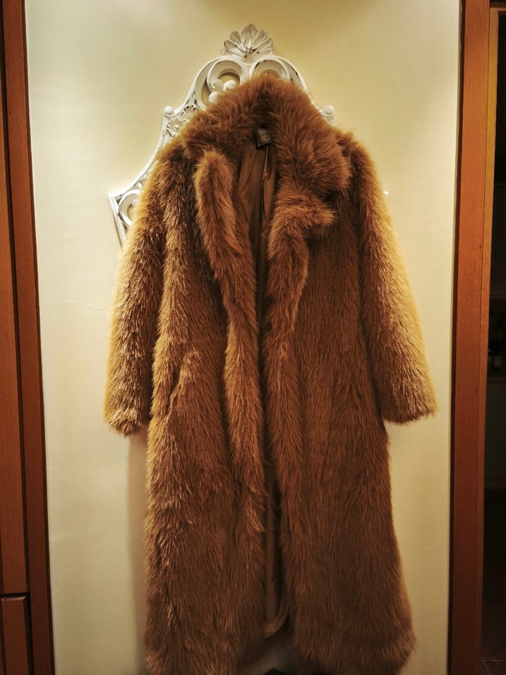 taba rengi uzun peluş kaban, yakalı ve uzun kollu olup bol kesimdir. Rahat ve bohem tarzıyla günlük kullanıma uygundur. boyu 120 cm m beden