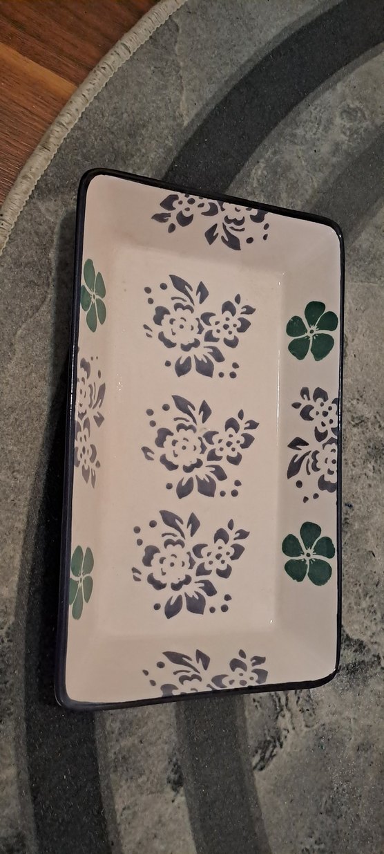 İç kısmında koyu renk çiçek desenleri ve kenarlarda yeşil çiçekler bulunan beyaz dikdörtgen yiyecek kabı. Üst kısmında koyu renk bir çerçeve var. ️sifir urun 26 ya 15.30 olcusu derinlik 4 cm