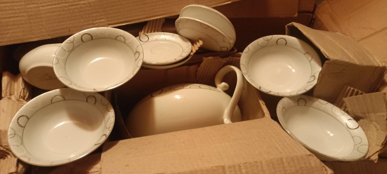 Beyaz, klasik tarzda, hafif renk tonunda ve zarif dairesel desenli tabak takımı hiç kullanılmadı sıfır kutusunda