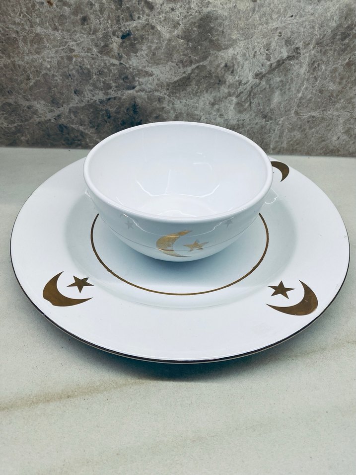 Parlak beyaz renkte, ay yıldız desenli tabak ve kase seti. Geleneksel ve sade tasarıma sahiptir. İADE YOKTUR
