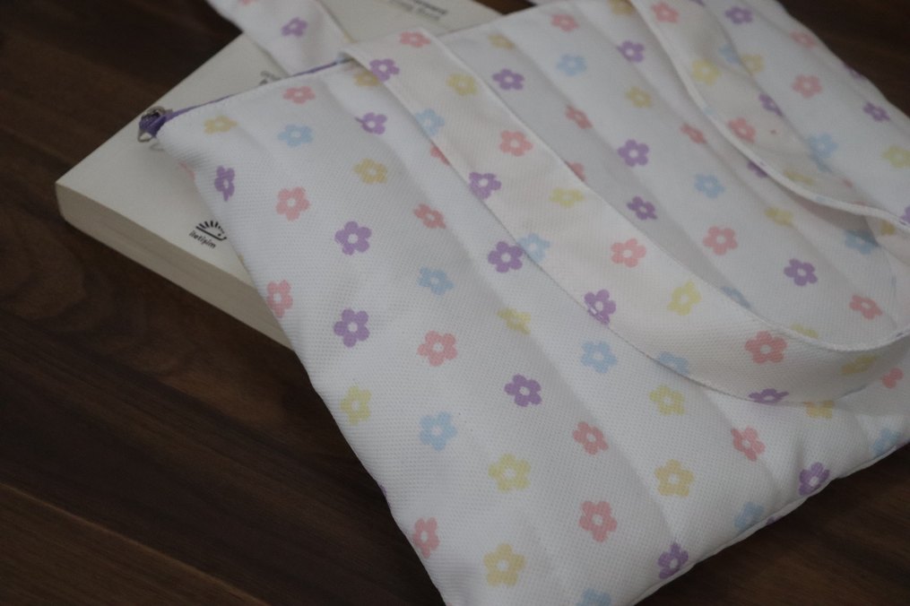 Beyaz zemin üzerine pastel tonlarda pembe, mor, mavi ve sarı çiçek desenleri bulunan yumuşak kitap tablet çantası . 11 inç fiyatımızdır