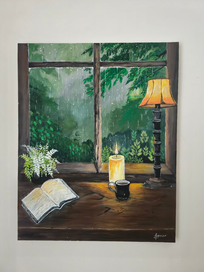 akrilik boya ile kendim resimledim. mum ve lamba aydınlığında huzurlu bir atmosfer. doğa ağaç sevenler için harika bir ambians.40x50
