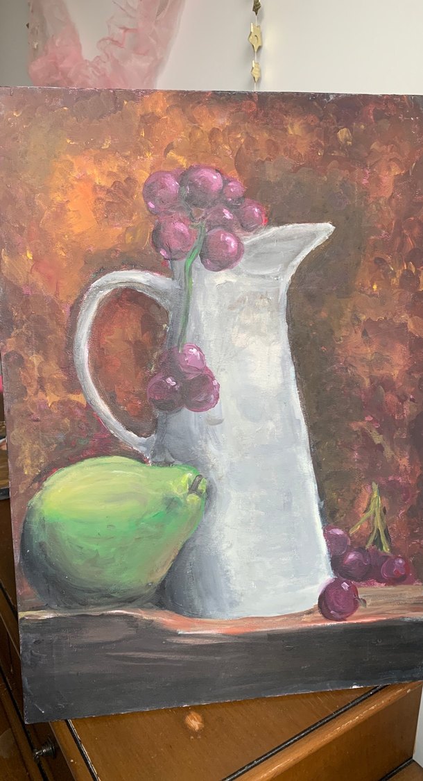 Sıcak ve dokulu arka planda beyaz sürahi, üzüm ve yeşil meyve içeren pastel renkli tablo. Natürmort tuval kendim yaptım akrilikle 50-75 boyutlarında ogrenciyim yardımcı okursanız çok mutlu olurum
