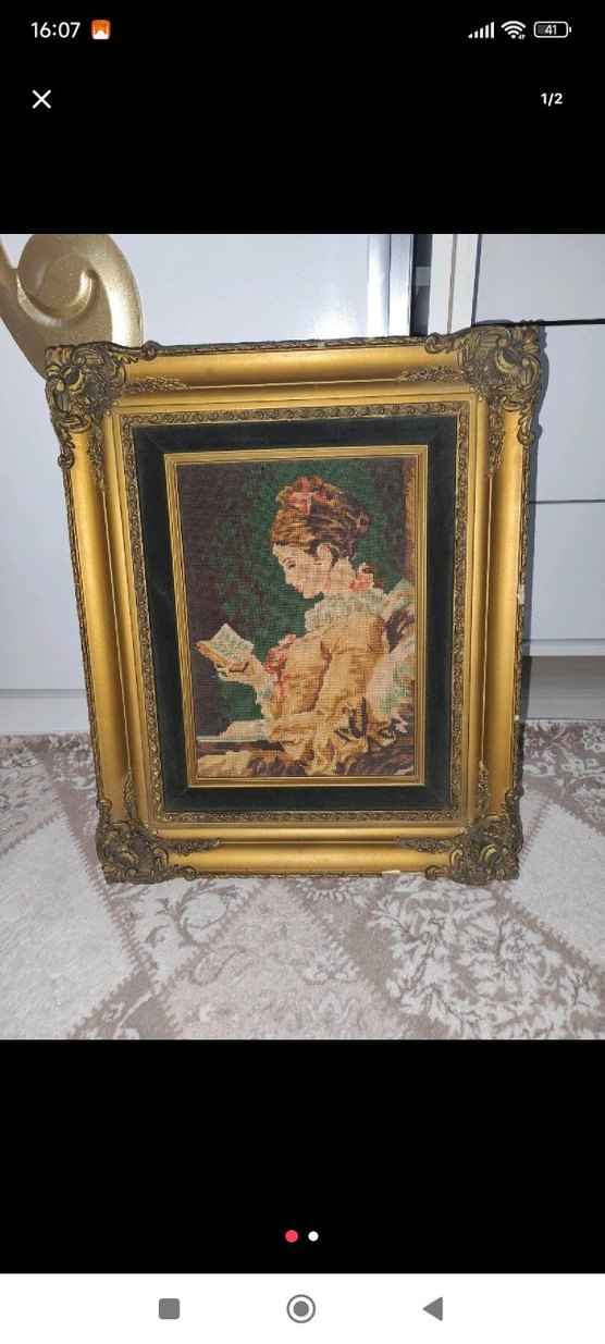 Detaylı köşeleri ve vintage tarzı resmiyle altın renkli klasik çerçeve. Koyu tonlar eserin renkleriyle uyumlu.